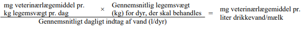 Baseret på den anbefalede dosis, antallet af dyr, der skal behandles, samt disses legemsvægt bør den nøjagtige daglige koncentration af veterinærlægemidlet beregnes efter følgende formel: